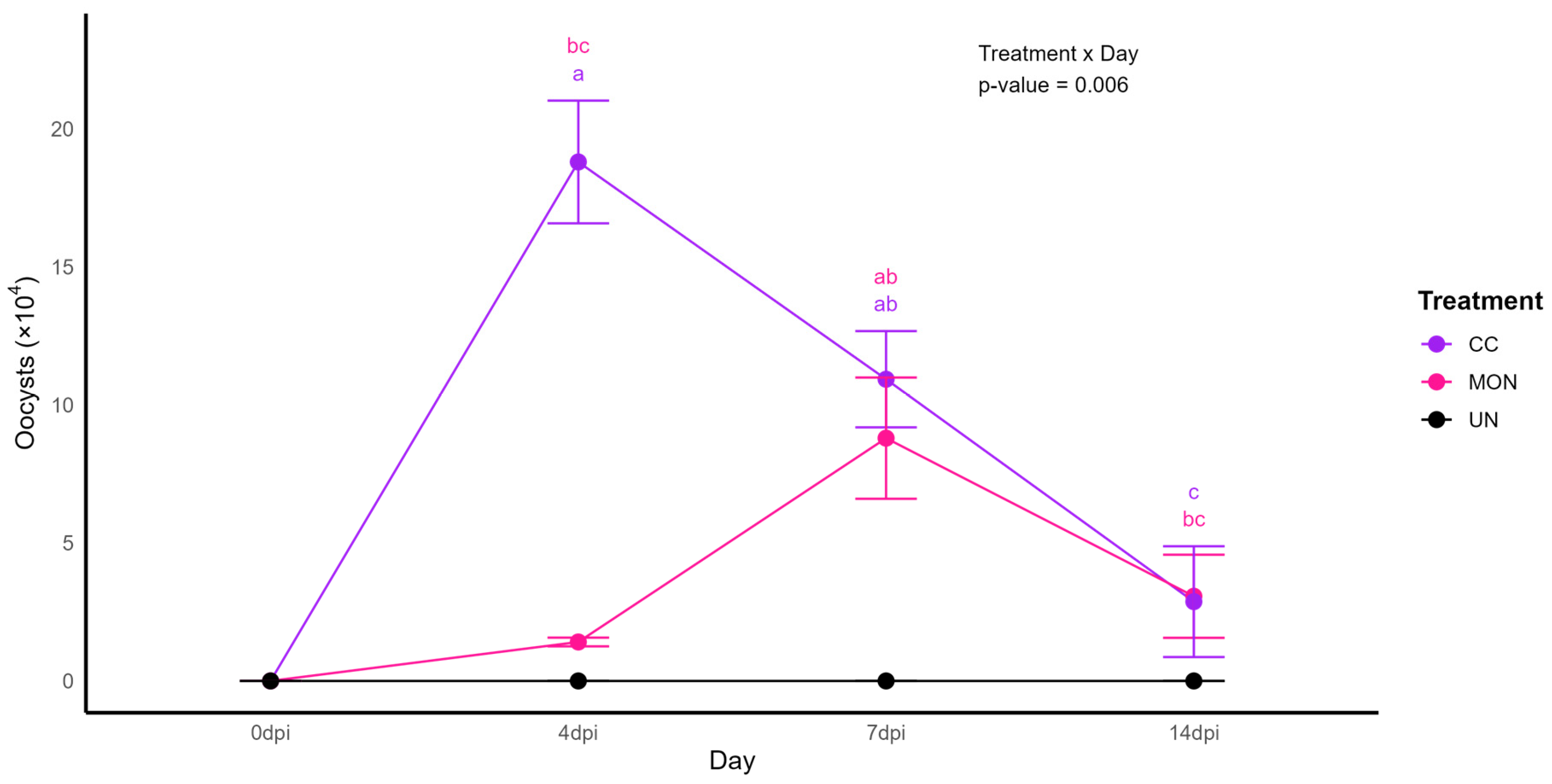 | Presence of oocysts | 0.00 c | 1.50 b | 5.01 a | 0.609 | <0.001 |