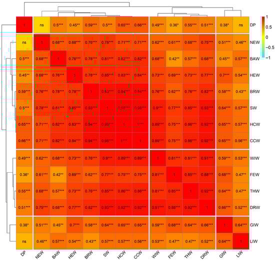 Pearson correlation analysis was performed to assess the linear relationships among all quantitative variables in the study. The statistical significance of correlations was determined through two-tailed hypothesis tests, establishing significance levels of p < 0.05 (*), p < 0.01 (**), and p < 0.001 (***). Correlations that did not reach statistical significance (p ≥ 0.05) were identified as “ns” (non-significant).
