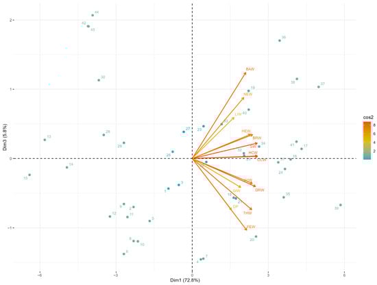 The vectors corresponding to body weights and main carcass parts (breasts, thighs, drumsticks, wings, and backs) projected in the same direction on the horizontal axis (PC1), confirming their high positive correlation and contribution to the general size factor. In contrast, the dressing percentage vector projected in the opposite direction on the vertical axis (PC2), evidencing that this variable captures variation independent of absolute body size. The dispersion of individuals along the PC1 axis reflected the variability in the overall sizes of the carcasses, while their distribution on PC2 indicated differences in carcass yield efficiency among individuals of similar sizes. The biplot of PC1 versus PC3 represented 78.62% of the cumulative variance and allowed visualization of an additional contrast in body composition (Figure 3). In this plane, variables associated with internal organs (the liver and gizzard) showed vectors with negative loadings on PC3, while variables related to skeletal parts (the neck and feet) presented positive loadings. This configuration revealed that PC3 captures variation in the relative proportions between visceral mass and musculoskeletal structures, independent of the total body size represented by PC1. The distribution of individuals in this two-dimensional space evidenced heterogeneity in body development patterns, identifying carcasses with a greater proportion of viscera versus those with greater development of structural components.
