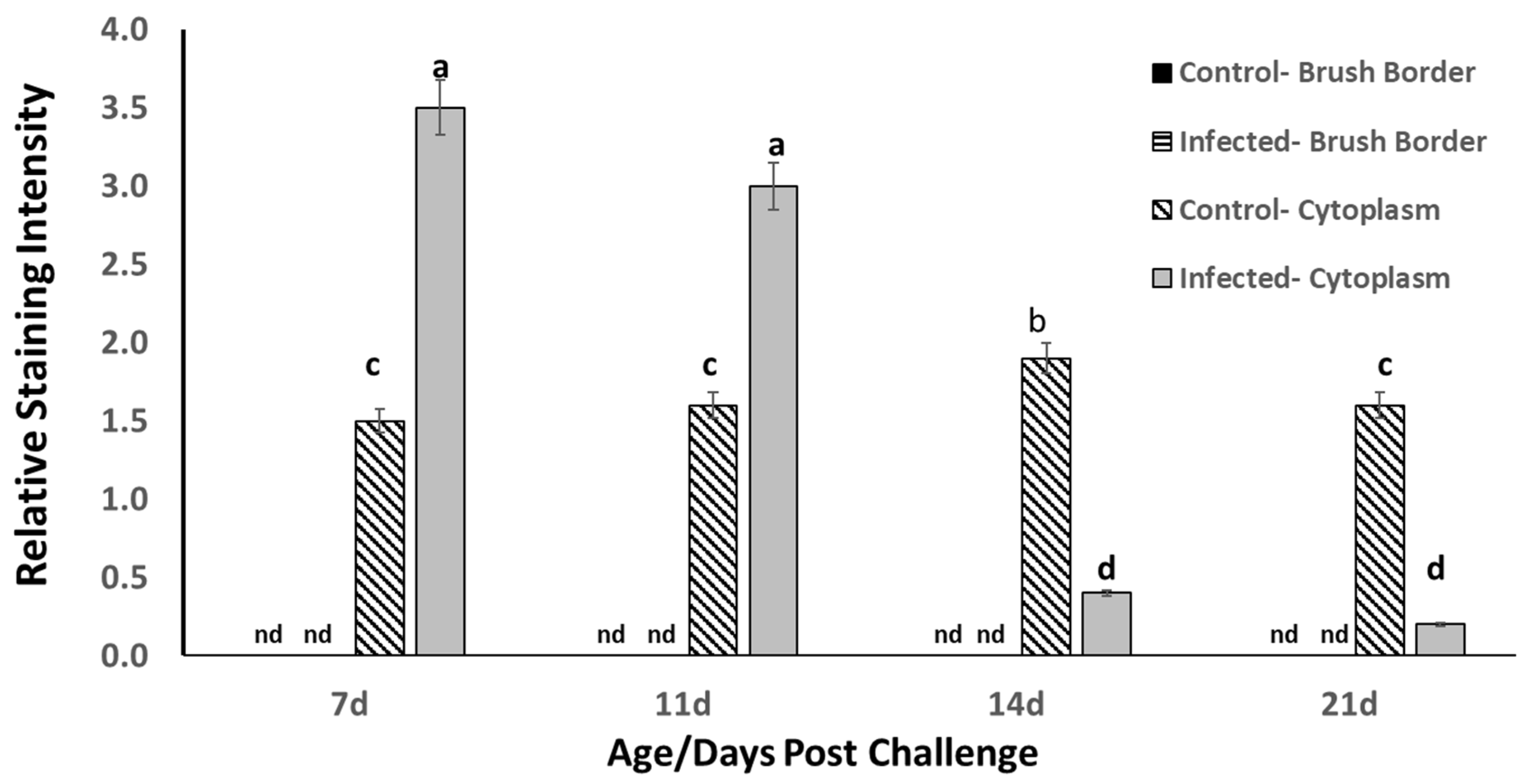 At 7, 14, and 21 d of age/post challenge, 7 randomly caught poults from control and infected groups were euthanized via carbon dioxide asphyxiation. Then, 2 euthanized poults from each group were subjected to