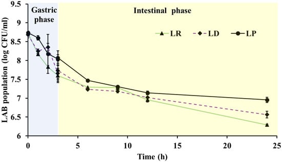 Survival of Lactobacillus delbreuckii subsp. bulgaricus NRRL-B-548 (LD), Lacticaseibacillus rhamnosus NRRL-B-442 (LR) and L. paracasei DUP-13076 (LP) during stimulated in vitro gut transit assay. LP, LD and LR were cultured in artificial gastric juice for 3 h, then transferred to simulated intestinal juice for a period of 24 h. Data are expressed as mean ± SE.