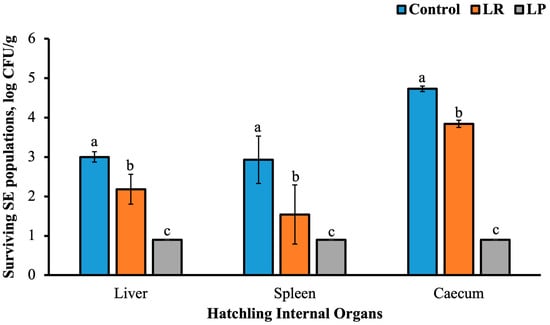 Effect of probiotic spray application to hatching eggs on Salmonella Enteritidis populations in the hatchling liver, spleen, and caecum. Different superscripts indicate statistical significance between treatment groups within each tissue type at p ≤ 0.05. The limit of detection for plate counts was 1 log CFU/sample.