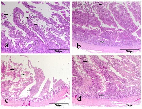 HE×100. (a) Experimental group I, duodenum, desquamation of the enterocytes (black arrow); (b) experimental group II, duodenum, desquamation of the enterocytes (black arrow), infiltration of the lamina propria with lymphocytes (white arrow); (c) experimental group V, duodenum, desquamation of the enterocytes (black arrow), infiltration of the lamina propria with lymphocytes (white arrow); (d) experimental group VI, duodenum, desquamation of the enterocytes (black arrow), infiltration of the lamina propria with lymphocytes (white arrow).