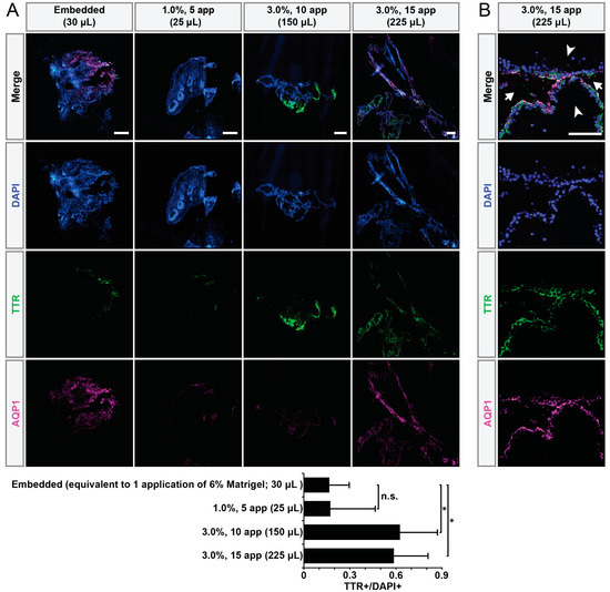 We hypothesized the cystic phenotype would reflect distinct cellular composition. Due to similarities in the morphology of the large fluid-filled hCOs to the choroid plexus (ChP) hCOs generated by Pellegrini and colleagues [2], we hypothesized that high Matrigel exposure increased ChP differentiation. To test this, we immunostained for transthyretin (TTR), a transporter protein produced in the ChP (Figure 3A and Figure S1). Compared to the embedded control, hCOs exposed to high-Matrigel conditions exhibited significantly increased numbers of TTR+ regions. Additionally, we examined whether the fluid-filled cysts of the ChP hCOs exhibited expected apical polarization [2]. We confirmed the correct apical–basal polarity of the ChP hCOs fluid-filled cysts through observing the co-localization of TTR with apical water transporter aquaporin-1 (AQP1) (Figure 3B and Figure S1). Fluid-filled cysts exhibited co-localization of TTR with apical water transporter aquaporin-1 (AQP1), confirming correct apical–basal polarity (Figure 3B).
