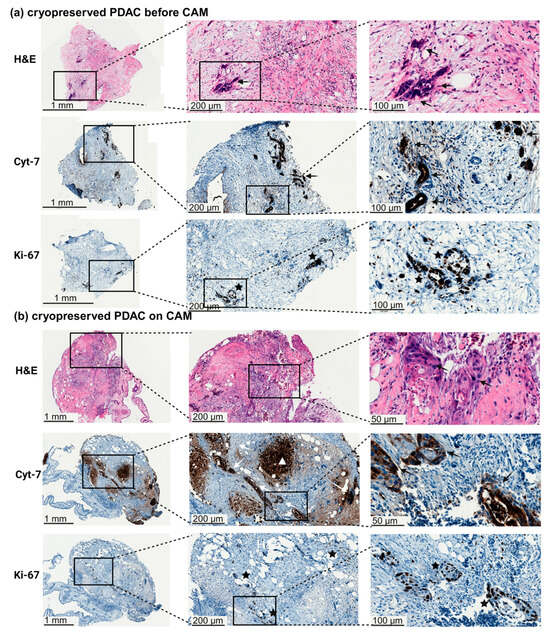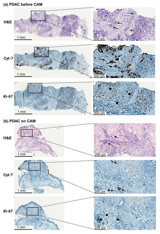 Histological examination of a PDX before and after growth on the CAM. Whole slide H&E, Cytokeratin7, and Ki-67 staining. (a) Recently resected PDAC tissue on the day of surgical resection before engraftment on the CAM. (b) Recently resected PDAC after 7 days of engraftment on the CAM. Scale bar = 1 mm and 200 µm, 100× magnification (created with BioRender.com). Atypical ducts of the PDAC (arrows), elevated proliferation within the tumor visible by increased nuclear Ki-67 staining (stars).