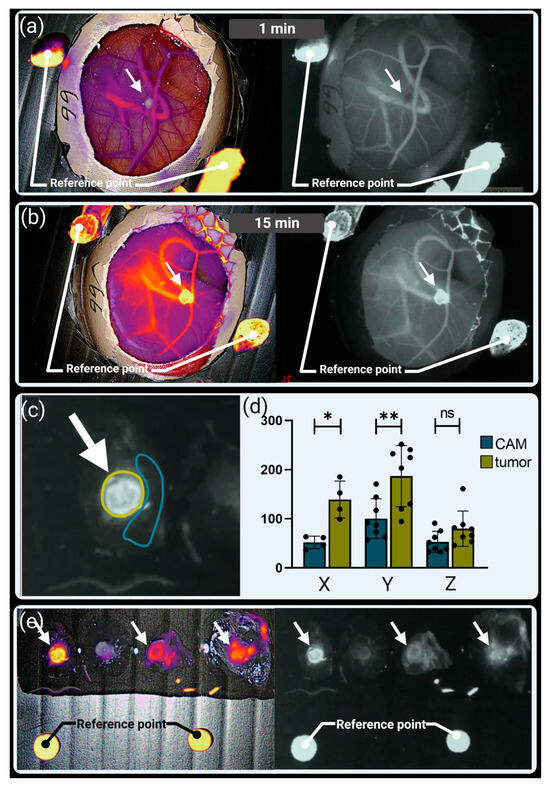 Furthermore, this study aims to establish near-infrared imaging as a standardized method in the well-described CAM model to confirm the connection of human tissue to the circulating system of the embryo and to visualize and quantify intratumoral perfusion. These results could serve as a basis for the investigation of intravenously administered therapeutics and their effects in further projects. Moreover, the CAM model can also be used to analyze the process of metastasis to gain a more in-depth insight into tumor biology and new therapeutic targets.