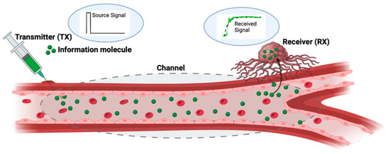 It is of utmost importance to understand the distribution of drug molecules and drug carriers, such as nanoparticles inside the circulatory system, and their ability to reach target sites to design and optimize drug delivery systems. Molecular communications (MC) is a novel, nature-inspired communications paradigm where the information is encoded in the properties of molecules [56] instead of electromagnetic waves (Figure 8). In the past years, the MC paradigm has been exploited to gain more insight into and the control of the operation of biological systems and to design and implement synthetic MC systems. For example, in medical applications, MC systems are expected to facilitate the distribution of nano-scale sensor networks for the detection of diseased cells and allow the control of actuators for targeted drug release [57].
