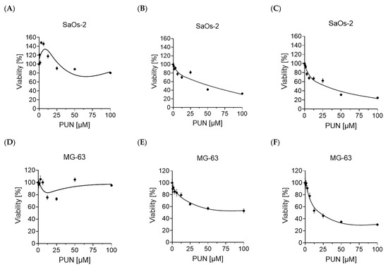 Viability of SaOs-2 and MG-63 cells after exposure to different concentrations of punicalagin (≤100 µM) measured in an MTT assay after 24 h (A,D), 48 h (B,E), and 72 h (C,F).