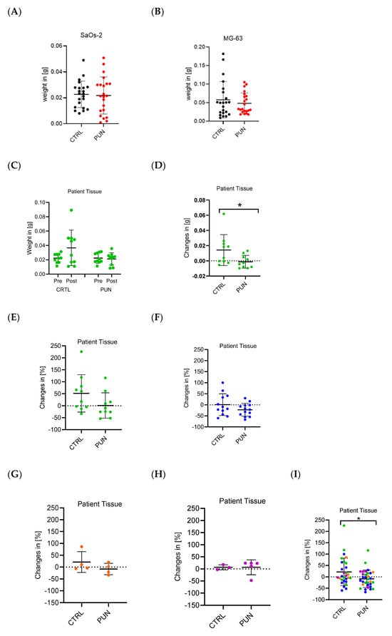 Weight of SaOs-2 (A) and MG-63 (B) cell line tumors and osteosarcoma primary tissue (C–E) after explantation. Absolute weight (C) and absolute weight differences (D) of one representative patient’s tissue before engraftment (pre) and after explantation (post). (E–I) Relative weight differences of the tissue from all four patients represented in different colors. Tissue weight changes of 51.38% ± 24.63% (CRTL) and 1.01% ± 16.71% (PUN) for green (E), 0.80% ± 14.22% (CTRL) and −22.54% ± 8.09% (PUN) for blue (F), 21.42% ± 21.92% (CTRL) and −8.10% ± 12.02% (PUN) for orange (G), and 6.70% ± 6.03% (CTRL) and 6.71% ± 13.83% (PUN) for purple (H). Data were analyzed using Welch’s t-test (* p < 0.05).
