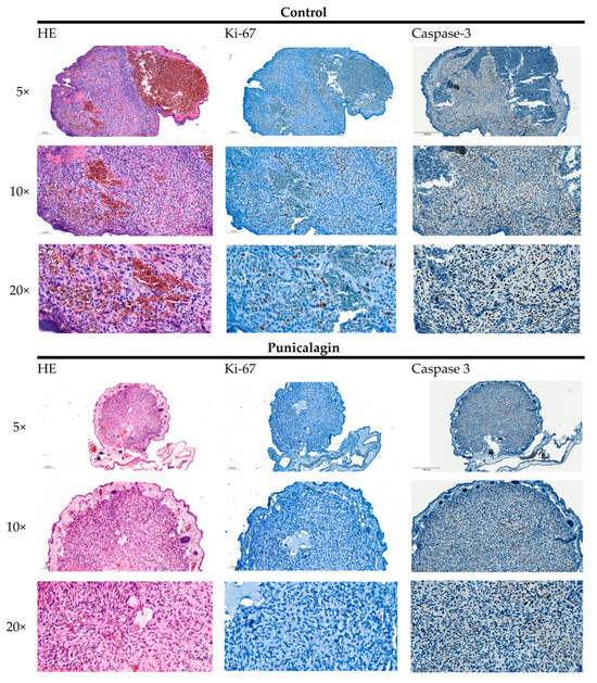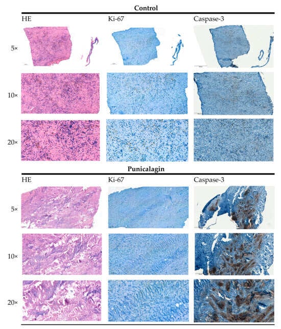 HE, Ki-67, and Caspase-3 staining of two representative CAMs engrafted with MG-63 cell line tumors from the control group (above) and the group treated with punicalagin (below). Fivefold (5), tenfold (10), and twentyfold (20) magnifications are shown, respectively.