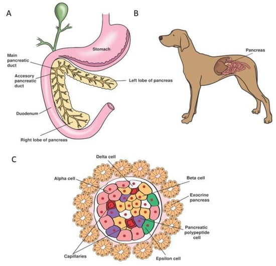 (A) Anatomy of the canine pancreas: a slender, V-shaped organ situated between the greater curvature of the stomach and the descending duodenum. (B) The canine pancreas in situ. (C) An architectural model of the canine pancreas: the exocrine pancreas surrounds the islet of Langerhans (endocrine pancreas). Figure created in Adobe Illustrator 2020 (Adobe, San Jose, CA, USA).