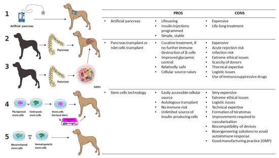 Possible future treatments of canine type 1 diabetes mellitus: (1) an artificial pancreas placed on a dog. (2) The allotransplantation of a pancreas from a donor dog to a diabetic dog. (3) The allotransplantation of pancreatic islets from a donor dog to a diabetic dog. (4) Differentiation of pluripotent stem cells or embryonic stem cells into β-cells that are transplanted with or without an encapsulation device to the diabetic dog. (5) The injection of mesenchymal stem cells and/or hematopoietic stem cells for immunomodulation in favour of β-cell survival. In parallel, the pros and cons of each approach are informed. Figure created in Adobe Illustrator 2020 (Adobe, San Jose, CA, USA).