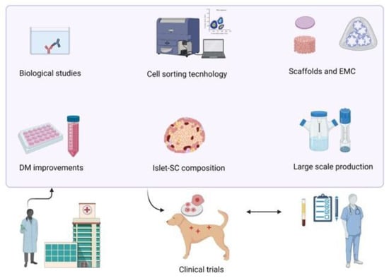 The remaining challenges for the use of stem cell β-like cells in type 1 diabetes mellitus therapy. In vitro studies related to the optimisation of differentiation medium (DM) and biological assays to evaluate cellular functionality are the initial steps. Cell sorting techniques used to define islet stem cell composition could be useful for future approaches. Bioengineering technology advances are required to (i) improve the biocompatibility and vascularisation of scaffolds to assure the longevity of cells within the device, while avoiding the host immune response; (ii) the replacement of the extracellular matrix (EMC) from animal origin with a synthetic hydrogel; (iii) ensure large-scale production of cells essential for future use. Clinical trials will be needed to determine the cell dose, the best implantation site, and the effectiveness of treatment. Figure created in Biorender.com.
