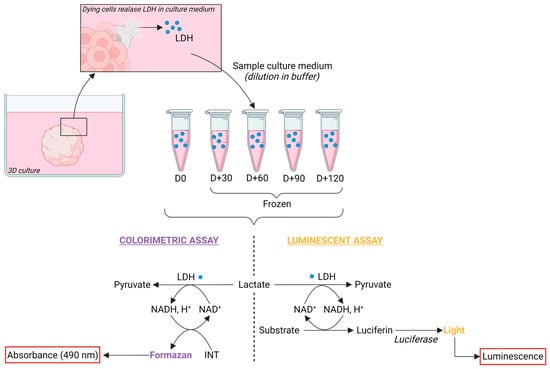 Nevertheless, the transition from 2D to 3D culture systems presents a unique set of challenges, with one of the foremost being cell viability assessment over time. Historically, lactate dehydrogenase (LDH) activity assays have served for assessing cellular viability, particularly in the context of 2D cell cultures [19,20,21]. LDH, a cytoplasmic enzyme, present in almost all cell types [22,23], is released into the extracellular environment when the cell membrane is damaged [21]. The LDH activity assay, performed on a conditioned culture medium, is based on the enzymatic conversion of lactate to pyruvate by LDH, carried out in the presence of nicotinamide adenine dinucleotide (NAD+). This enzymatic process results in the reduction in NAD+ to NADH, H+, and the concomitant oxidation of lactate to pyruvate [24]. Then, the regeneration of NAD+ by oxidation of NADH, H+, is generally coupled to the production of either a colored or a luminescent molecule, which can be detected using a spectrophotometer or a luminometer. The amount detected is directly proportional to the amount of LDH present in the medium, and thus is correlated to the cell viability in the culture conditions. Described for the first time in 1960 [19], the most common LDH assay relies on a tetrazolium salt, which is reduced into formazan, a red product that can be quantified using spectrometry [25,26,27]. Variants of this historical assay have been described [28,29,30,31], and several commercially available LDH activity detection kits have been developed. An LDH assay provides rapid and robust results to assess cell viability in a non-invasive manner, and enables the monitoring of cell culture over time thanks to regular sampling of a conditioned medium. This assay is also adapted to cytotoxicity evaluation of compounds, and cytoprotective studies of drug candidates [21].