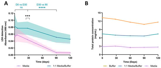 Stability of Lactate Dehydrogenase and total protein concentration in preservation buffer at −20 °C over time. (A) LDH stability was evaluated over time. Samples of cerebral organoids conditioning the medium, with or without preservation buffer, were frozen and analyzed at day 0, 30, 60, 90, and 120 post-collection. Without a preservation buffer, LDH stability declines after one week of preservation at −20 °C (D30w/o buffer vs. D30buffer, p = 0.0008, nested t-test, n = 3 organoids). Preservation buffer maintains LDH stability for up to one month at −20 °C (D0buffer vs. D30buffer, p = 0.1807; D30buffer vs. D90buffer, p < 0.0001, nested t-test, n = 3 organoids). (B) Total protein concentration was quantified in the conditioned medium, conditioned medium diluted in preservation buffer, and preservation buffer alone. Total protein concentration remained stable over time (D90buffer vs. D120buffer, p = 0.6629; D90media/buffer vs. D120media/buffer, p = 0.3810; mixed-effects analysis followed by Tukey’s post hoc, n = 3). ns: not significant; ****: p < 0.0001; ***: p < 0.001.