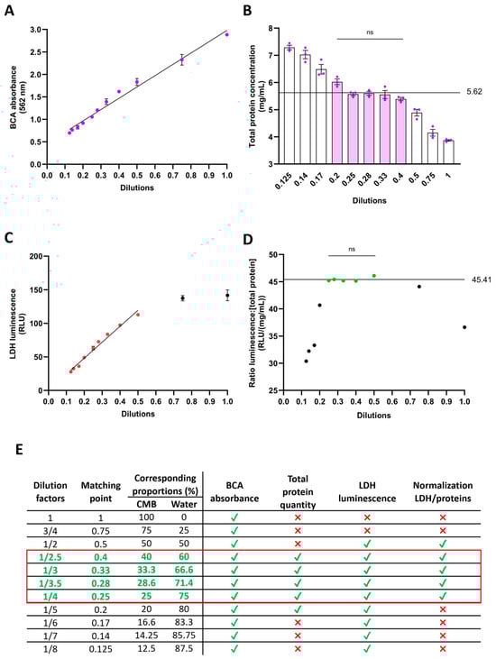 Dilution optimization of 1:1 conditioned medium in LDH-preservation buffer. The addition of preservation buffer to conditioned medium increases the protein content. To prevent saturation of absorbance or luminescence detection, various dilutions of the 1:1 medium/buffer in water were assessed. (A) BCA reaction to quantify protein content. Linearity was maintained across all dilutions. (B) Total protein concentration detection, taking into account the dilution factor. Dilutions ranging from 1/2.5 to 1/5 yield protein concentration detection comparable to 5.62 mg/mL (filled bars). (C) LDH detection using the luminescent assay. Signal linearity was maintained for dilutions from 1/2 to 1/8 (colored dots). (D) Validation of luminescence to total protein ratio. Ratios within dilutions ranging from 1/2 to 1/4 are not significantly different from 45.41 RLU/(mg/mL) (colored dots). (E) Summary Table of validated dilutions. For each test, green ticks indicate validation of the dilution and red crosses non validation. The red square highlights the dilutions that were validated with all tests. ns: not significant.