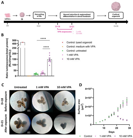 Valproic acid exposure on cerebral organoids increases LDH release in the medium. (A) Cortical organoid generation timeline. hiPSCs were aggregated into embryoid bodies (EB) before being differentiated into dorsal forebrain organoids. Organoids were exposed to either 1 mM or 10 mM VPA at day 18 for 72 h. Created with BioRender.com. (B) Subsequently, at day 21, LDH activity was detected using the luminescent assay, and was normalized using total protein concentration. Treatment with 10 mM VPA significantly increased LDH levels in the medium compared to untreated organoids (LDHuntreated = 17.87 RLU/(mg/mL) ± 1.91 SEM; LDH10 mM VPA = 147.89 RLU/(mg/mL) ± 11.53 SEM; n = 8–9 organoids per condition; one-Way ANOVA followed by Tukey’s multiple comparison; F(4, 24) = 142.2; p < 0.0001). Control: medium with VPA containing 10 mM VPA. (C) Organoids observed with optical brightfield microscopy (5×) before and after VPA exposure. Control and 1 mM VPA exposed organoids showed no morphological difference. Organoids exposed to 10 mM VPA exhibited cellular loss associated with smaller organoid size and darker color, suggesting cell death. (D) Growth profiles of the cerebral organoids over 30 days. After exposure to 10 mM VPA at day 18, the area of the organoids started to decrease, further confirming cell death induction. In contrast, organoids treated with 1 mM VPA exhibited the same growth profile as the controls, suggesting no detrimental effects of VPA at this lower concentration. ****: p < 0.0001.