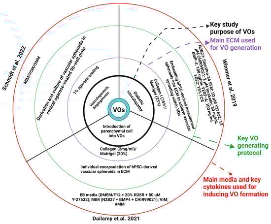 Diagram showing the main methods to generate vascular organoids (VOs), Created with BioRender.com. The basic protocol for VO generation from hPSCs to hiPSCs is based on a stepwise differentiation of hPSC (or hiPSC) aggregates with sequential changing of culture media and further differentiation into vascular networks in a 3D matrix, with a variety of modifications as reported by Wimmer et al. [15], Schmidt et al. [16], and Dailamy et al. [17], respectively. It is worth noting that Penninger’s group [15,18,19] reported the first generation of VOs from hPSCs, which was quickly adapted by other laboratories such as Romeo et al. [20] and Nikolova et al. [21]. MIM, mesoderm induction medium (DMEM-F12, 2 mM, Ascorbic acid, 355 μM CHIR 99021, 10 μM BMP4); VGM, vascular growth medium (Neurobasal medium/DMEM-F12, N2B27, 2 mM Ascorbic acid, 100 ng/mL VEGF-A); OMM, organoid maintenance medium (Neurobasal medium/DMEM-F12, N2B27, 2 mM Ascorbic acid); VIM, vascular induction media (N2/B27 + VEGF + FSK); VMM, vascular maturation media (StemPro + 15%FBS + VEGF + bFGF).