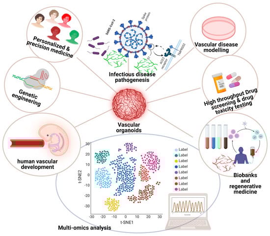 Schematic illustration of the key applications for vascular organoids (VOs). Increasing numbers of studies demonstrate a variety of promising applications for hPSC-derived VOs, including infectious disease pathogenesis (such as SARS-CoV2 and pathogenic bacteria), in vitro vascular disease modeling, high-throughput drug screening and drug toxicity testing, creating human VO biobanks for regenerative medicine, multi-omics analysis to probe novel insights into signaling pathways underlying vascular development and disease etiology, exploring key developmental events in human vascular systems, genetic engineering and editing for inherited disorders, and personalized and precision medicine. Diagram is created with BioRender.com.