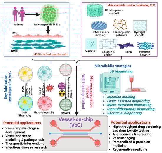 Schematic diagram illustrating the main strategies to generate vessel-on-chip (VoC) and potential applications of VoCs. Different functional vascular cells can be derived from human-induced pluripotent stem cells (hiPSCs), which are incorporated into various 3D microporous scaffolds to create functional VoCs using a variety of fabrication techniques and microfluidic strategies. These human VoCs offer a wide range of potential applications, encompassing various fields such as studying vascular physiology, pathology, and potential therapeutic interventions, exploring infectious disease pathogenesis, using for in vitro vascular disease modeling as well as high-throughput drug screening and drug toxicity testing, providing novel insights into vascular aging and angiogenesis, and creating human VoC biobanks for regenerative medicine. EC, endothelial cell; SMC, smooth muscle cells; SMART, substrate modification and replication by thermoforming. Diagram is created with BioRender.com.