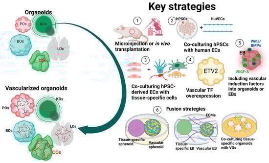 - Liu, H.; Zhang, X.; Liu, J.; Qin, J. Vascularization of engineered organoids. BMEMat 2023, 1, e12031. [Google Scholar] [CrossRef]