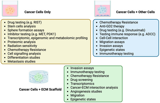 Applications of 3D Models in Neuroblastoma Research. Key applications of various 3D culture models in neuroblastoma research, including their use in drug screening, studying chemotherapy resistance, or transcriptomic and epigenomic profiling. This image was created with BioRender (https://biorender.com/ accessed on 31 March 2025).