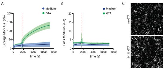 The architecture of the collagen gels with and without GTA was analyzed using reflection microscopy. No difference in fiber length and fiber diameter was observed, as shown in Figure 1C. We further quantified fiber density in three independent experiments using Fiji (National Institutes of Health, Bethesda, MD, USA, version 1.53c) [37]. A threshold was applied to a maximum projection of 5 z-slices and the area covered by the fibers was quantified (Figure S4B). No significant increase in fiber density in GTA gels was observed as compared to control collagen gels. Likewise, the collagen architecture appeared similar in gels with and without GTA cross-linking.