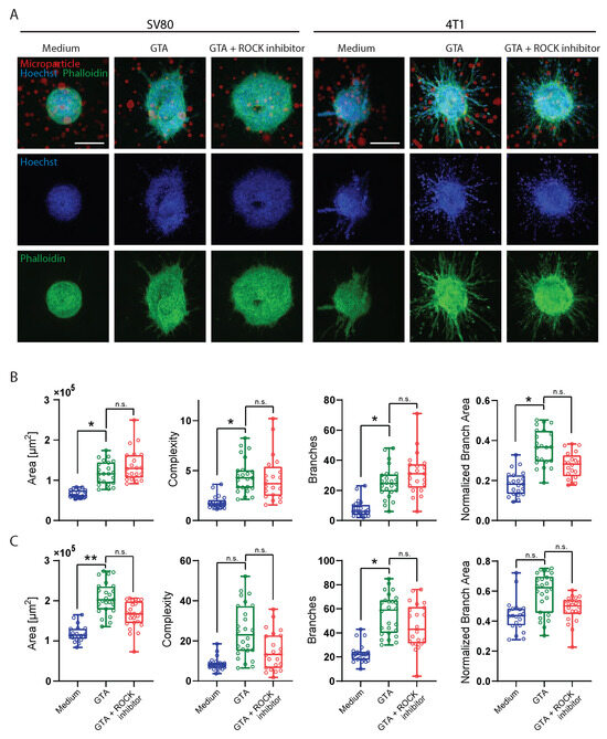 Migration of spheroids. (A) Maximum projections of SV80 and 4T1 spheroids after 72 and 48 h, respectively, cultured in soft gel (medium) and stiff gel (GTA). Scalebar: 200 m. (B) Area, Complexity, Number of branches, and branch area analysis of SV80 spheroids from three independent experiments. All spheroids from three experiments are plotted in the graphs. Calculations on p-values are performed with n = 3. (C) Area, Complexity, Number of branches, and branch area analysis of 4T1 spheroids from three independent experiments. All spheroids from three experiments are plotted in the graphs. Calculations on p-values are performed with n = 3. (ns: not significant; *: p < 0.05; **: ).