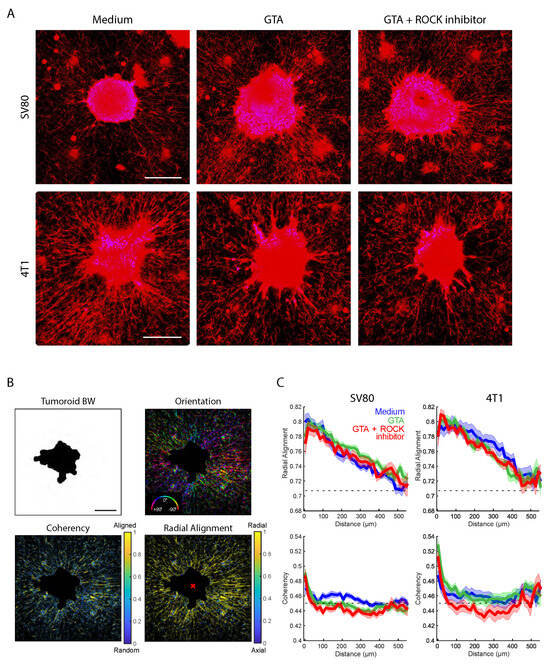 We next analyzed how 4T1 and SV80 spheroids remodeled the surrounding ECM fiber network, and how remodeling was affected by ECM stiffness. In soft ECM, both 4T1 and SV80 spheroids aligned the fibers of the collagen in the radial direction centered to the spheroid core. Consequently, 4T1 spheroids displayed much higher capacity to pull and create thick collagen bundles as compared to SV80 spheroids (Figure 3A). Remarkably, while GTA cross-linking appeared to slightly increase the number of thin radially oriented fibers around SV80 spheroids, the fiber network around 4T1 spheroids was depleted. For both cell types, inhibition of ROCK1/2 minimally affected collagen remodeling, confirming our observations with respect to spheroid invasion above.