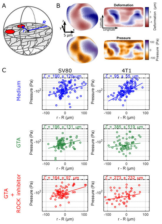 with core pressure and characteristic length scale on which the spheroid-induced mechanical stress dissipates into the gel. In the <10 Pa non-cross-linked gel, this length scale was shorter for 4T1 than for the SV80 spheroids, indicating that the SV80 fibroblasts extended pressure further into the surrounding ECM. Upon cross-linking, the effective reach of the pressure was similar in the soft (”medium”, m) and in stiff ECM (”GTA”, m) for SV80 fibroblast spheroids. On the other hand, the pressure reach of 4T1 spheroids increased dramatically from m in the soft ECM to >250 m in the stiff, GTA cross-linked, ECM. The inhibition of ROCK had little effect on this behavior for SV80 and 4T1 spheroids.