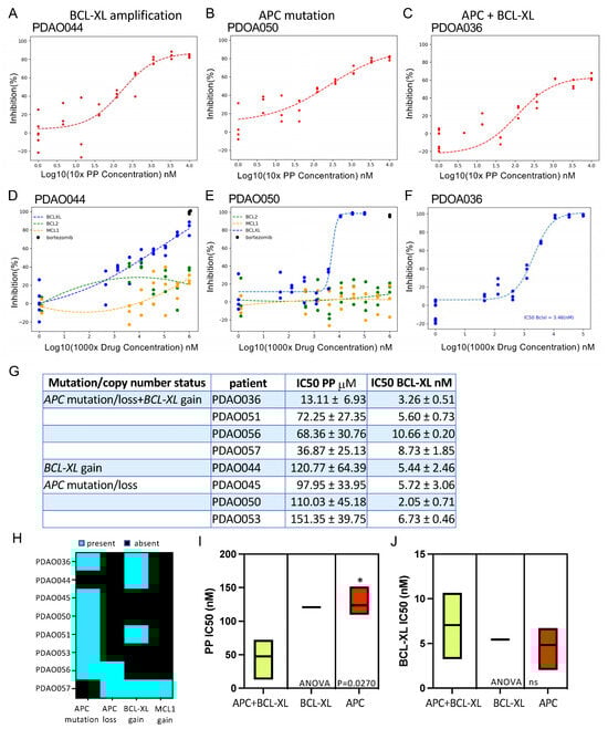 Adenoma cell growth is sensitive to Wnt and BCL-XL inhibitors. (A–C) Dose–response curves for the Wnt inhibitor pyrvinium pamoate (PP) tested against patient-derived adenoma organoids with BCL-XL amplification (A), APC mutation (B), and APC loss and BCL-XL amplification (C). Concentration of the compound is plotted on a log scale (x-axis) against the percent inhibition of cell growth (inhibition (%)) (y-axis). Individual values from triplicate measurements are plotted and are representative of at least n = 3 experiments. (D–F) Dose–response curves for the pro-apoptotic BCL-XL inhibitor tested against patient-derived adenoma organoids with BCL-XL amplification (D), APC mutation (E), and APC loss and BCL-XL amplification (F). Dose–response curves for pro-apoptotic BCL2 and MCL1 inhibitors are included for PDAO044 (D) and PDAO050 (E). The concentration of the compound is plotted on a log scale (x-axis) against the percent inhibition (y-axis). Individual values from triplicate measurements are plotted and are representative of at least n = 3 experiments. Bortezomib was used as a positive death control. Four-parameter linear regression was used to fit dose–response curves. (G) PP and BCL-XL inhibitor IC50 values for PDAO samples. Shown are mean ± SEM, n > 3. (H) Representation of pathogenic variants and DNA copy number changes for APC mutation, APC loss, BCL-XL amplification, and MCL-1 amplification for individual patient adenoma samples. Samples are arranged in rows with gene mutation, loss, or amplification (gain) shown in columns. (I,J) Multiple comparison analysis of patient-derived adenoma organoid genetic alterations and response to PP (I) and BCL-XL (J). Floating bars display the mean, minimum, and maximum values. Significance was determined by a one-way ANOVA test performed with the Bonferroni correction method for multiple comparisons. The ANOVA summary p-value is reported on the graph, and the stars above the sample data indicate the multiple comparison adjusted p-value, * p = 0.0270 for APC+BCL-XL (n = 4) and APC (n = 3); ns, not significant.