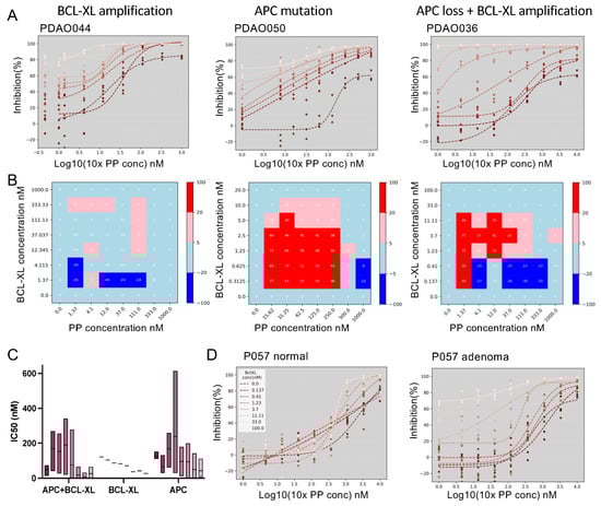 Synergy of combined Wnt and BCL-XL inhibitors in Wnt-driven PDAO. (A) Dose–response curves for the Wnt inhibitor pyrvinium pamoate (PP) with BCL-XL inhibitor titration against patient-derived adenoma organoids with BCL-XL amplification (left), APC mutation (middle), and APC loss and BCL-XL amplification (right). The concentration of PP is plotted on a log scale (x-axis) against the percent inhibition of cell growth (inhibition (%)) (y-axis) and BCL-XL inhibitor concentration coloured from light to dark with increasing BCL-XL concentration (0, 0.14, 0.41, 1.23, 3.70, 11.11, 33.0, 100 nM BCL-XL). Individual values from triplicate measurements are plotted and are representative of at least n = 3 experiments. Four-parameter linear regression was used to fit dose–response curves. Significance was determined using the R package “drc”, PDAO044 p < 0.005 at 33, and 100.0 nM BCL-XL; PDAO050 p < 0.05 at 3.7 nM, p < 0.001 at 33, and 100 nM BCL-XL. (B) Bliss synergy heatmaps for patient-derived adenoma organoids with BCL-XL amplification (left), APC mutation (middle), and APC loss and BCL-XL amplification (right) treated with distinct combinations of Wnt (x-axis) and BCL-XL (y-axis) inhibitors ranging from 0 to 1 μM. The heatmap represents the Bliss score coloured according to the scale, from 100 (high degree of synergy, red) to −100 (low degree of synergy, blue). (C) Multiple comparison analysis of patient-derived adenoma organoid genetic alterations and response to PP in combination with increasing concentrations of the BCL-XL inhibitor. Floating bars display the mean, minimum, and maximum values. (D) Organoids derived from normal tissue are less sensitive to the PP and BCL-XL inhibitor combination compared to adenoma organoids. Dose–response curves for the Wnt inhibitor pyrvinium pamoate (PP) with BCL-XL inhibitor titration against patient-derived organoids from normal colon (left) and adenoma (right) tissue, as in (A). Normal colon, not significant, adenoma p < 0.05 at 33, 100 nM BCL-XL.