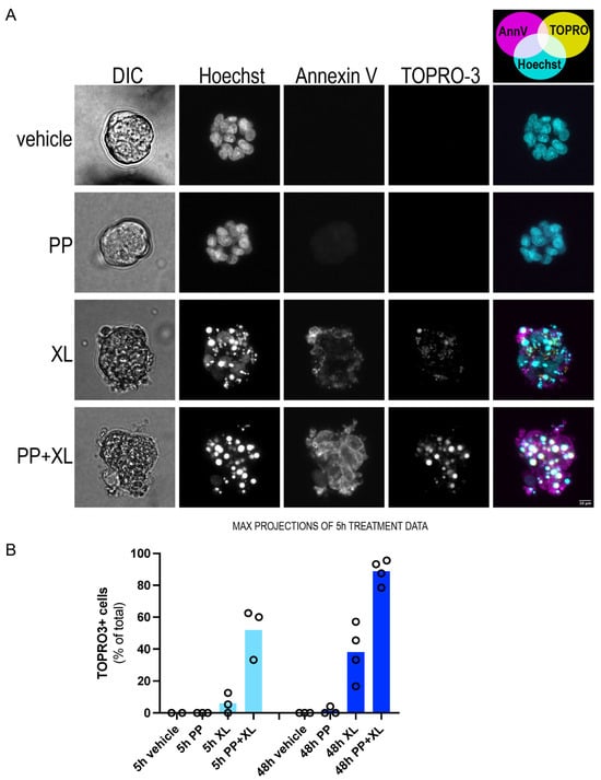 For cell death analysis, organoids were seeded in Matrigel domes in 8-well μ-slides (Ibidi DKSH Australia, Tullamarine, VIC, Australia #80826) overlaid with Organoid Growth Medium I. Organoids were grown under humidified 10% CO2 at 37 °C for 5 days before being treated with PP (1 μM), Bcl-XL inhibitor (0.1 μM), or PP (1 μM) + Bcl-XL inhibitor (0.1 μM). AlexaFluor488-conjugated Annexin V (1:500) (Thermo Fisher Scientific Waltham, MA, USA #A13201), TO-PRO-3 (1:2000; Thermo Fisher Scientific Waltham, MA, USA #T3605), and Hoechst 33342 (1:10,000; ThermoFisher Scientific Waltham, MA, USA #H3570) were added to the cultures immediately prior to imaging. Cells were imaged on an Inverted LSM 880 confocal microscope (Zeiss, Jena, China) with the following specifications: Plan-Apochromat 20×/0.80 air lens, 405, 488, and 633 nm laser lines, Zeiss photomultiplier tube, ZEN black 2.3 SP1 FP3 v14.0 capture software, and ImageJ Ver 1.52p post-acquisition processing software RRID:SCR_003070. Cells were maintained under humidified 5% CO2 at 37 °C.