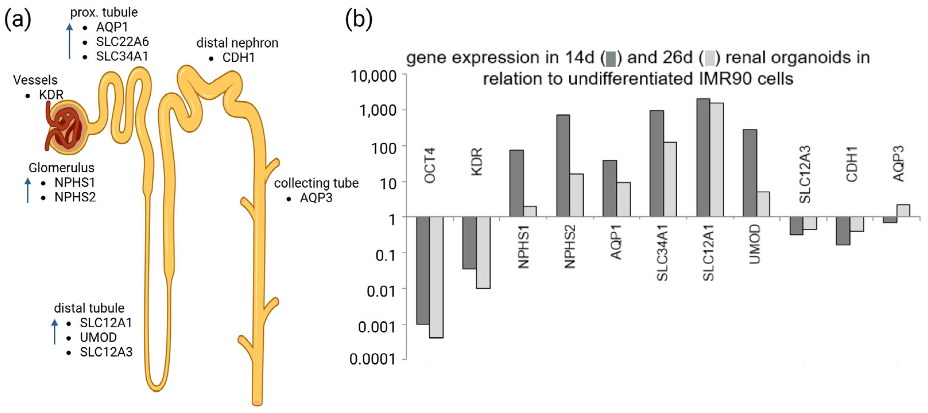 - Shi, M.; McCracken, K.W.; Patel, A.B.; Zhang, W.; Ester, L.; Valerius, M.T.; Bonventre, J.V. Human ureteric bud organoids recapitulate branching morphogenesis and differentiate into functional collecting duct cell types. Nat. Biotechnol. 2023, 41, 252–261. [Google Scholar] [CrossRef] [PubMed]