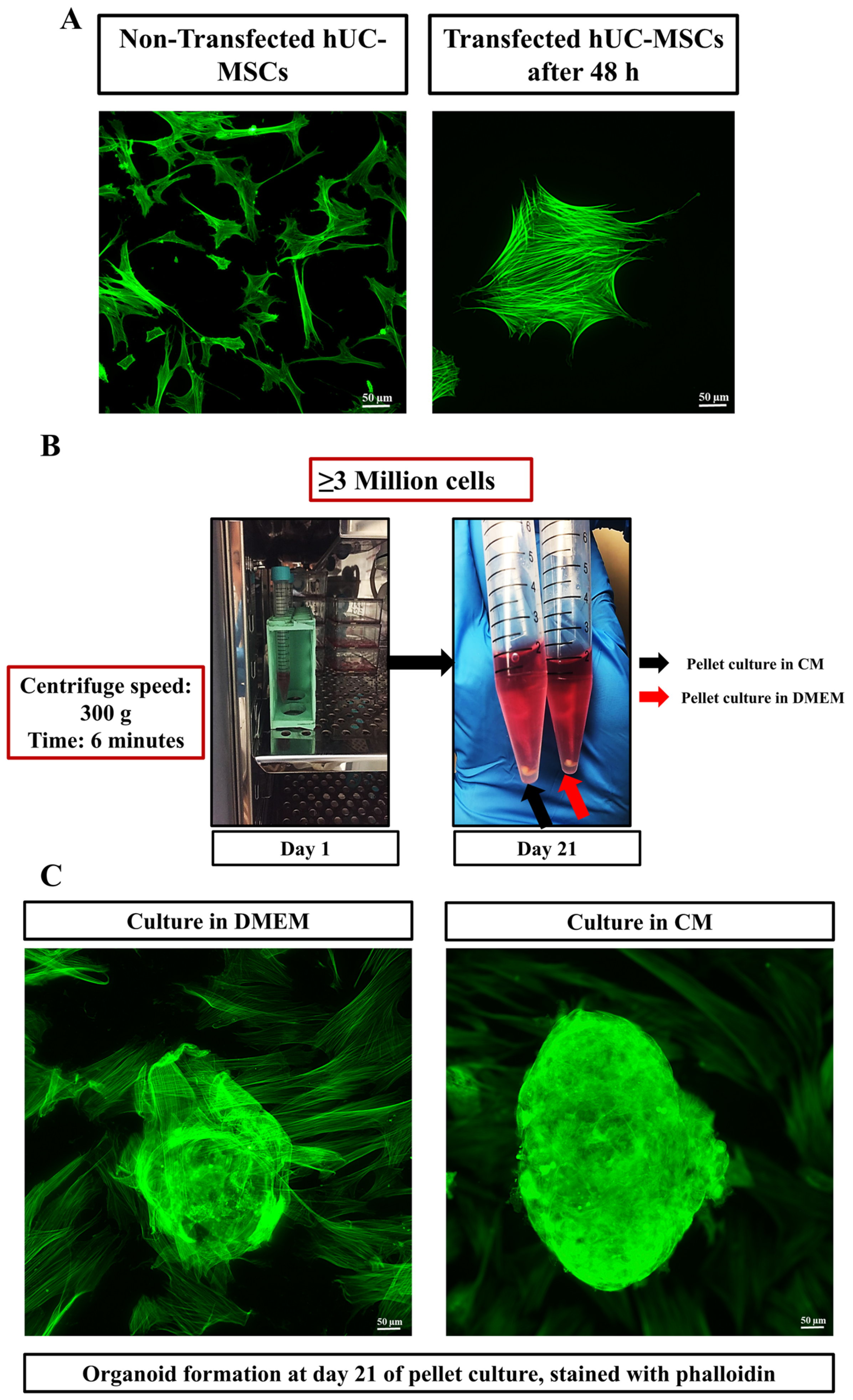 3.2. Characterization of Transfected hUC-MSCs in 2D and 3D Pellet Culture