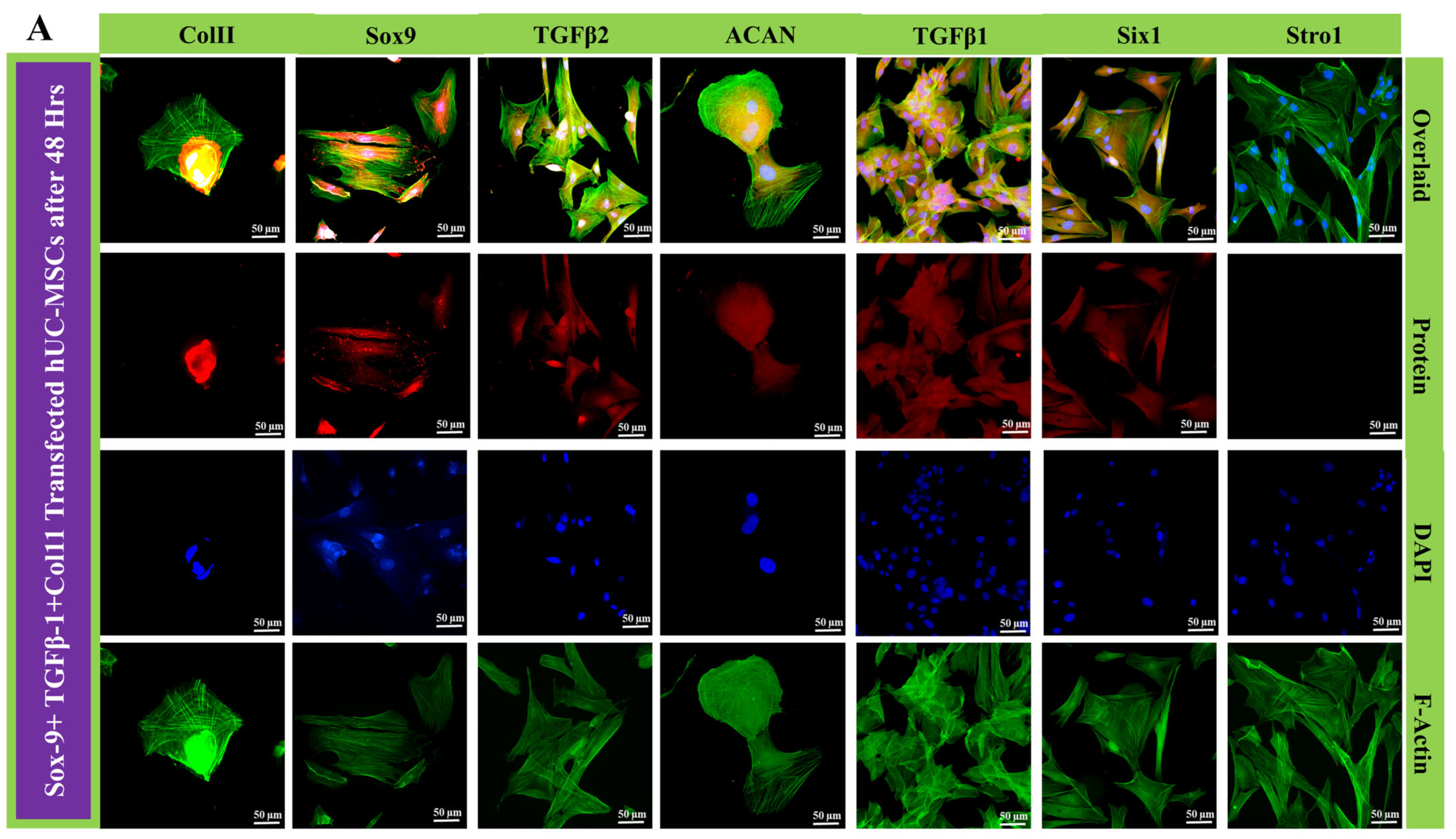 2.4. Overexpression of Chondrogenic Sox9, TGFβ1, and Col II in hUC-MSCs