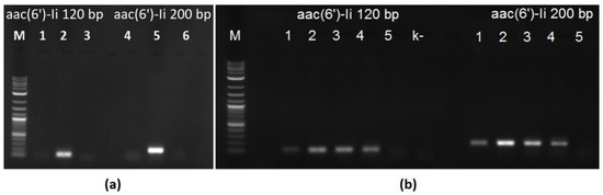Next, the genomes of four clinical vancomycin-resistant E. faecium isolates were sequenced and assembled. The resulting draft genome sequences were analyzed, and all of them contained the aac(6′)-Ii resistance determinant. Genomic DNA from these isolates was used as a PCR matrix with both the Ef_200 and Ef_120 primer pairs. All the amplification reactions yielded products of the expected sizes (Figure 1b).