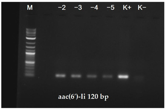In parallel with the PCR tests, all four clinical E. faecium isolates were observed to exhibit an aminoglycoside resistance phenotype (Figure 4). This finding suggested that the presence of aac(6′)-Ii can be detected independently, thus providing an additional method for cross-verifying the results of the proposed PCR-based identification procedure.