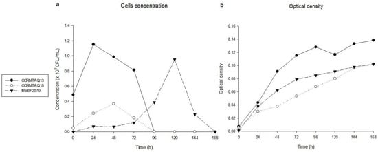 The three strains of X. citri pv. anacardii showed the apex of the exponential phase at 24, 48, and 120 h, reaching concentrations of 1.15, 0.36, and 0.95 × 108 CFU/mL, for the strains CCRMTAQ13, CCRMTAQ18, and IBSBF2579, respectively (Figure 1a). For the death phase, the absence of bacterial growth was observed at 96, 96, and 168 h for strains CCRMTAQ13, CCRMTAQ18, and IBSBF2579, respectively. In turn, the growth curves obtained from the absorbance of the suspension of the three strains showed progressive increases up to 168 h (Figure 1b).