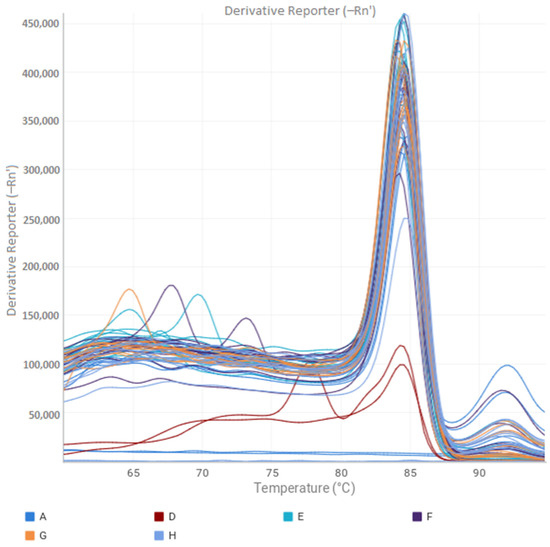 Melting curve of qPCR obtained from samples of strains CCRMTAQ13, CCRMTAQ18, and IBSBF2579 strains of Xanthomonas citri pv. anacardii for the relA gene. A1–A12—serially diluted samples for standard curve. D11–D12—blank test. E11–F4—Diluted samples of isolated CCRMTAQ13. F5–G8—Diluted samples of CCRMTAQ18. G9–H12—Diluted samples of IBSBF 2579.