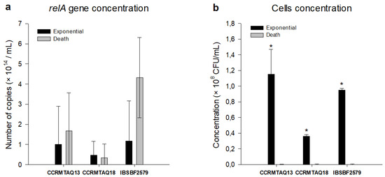 Considering the amplification of the relA gene, no significant differences were observed between the exponential and death phases, which presented 1.10 and 1.68, 0.47 and 0.33, 1.17 and 4.32 × 1014 copies/mL for CCRMTAQ13, CCRMTAQ18, and IBSBF2579 strains, respectively (Figure 3a). Considering the bacterial concentration in these phases, significant differences were observed between the exponential and death phases of all strains, with concentrations of 1.15, 0.36, and 0.95 × 108 CFU/mL for CCRMTAQ13, CCRMTAQ18, and IBSBF2579 (Figure 3b) in the exponential phase, while in the death phase growth was not observed.