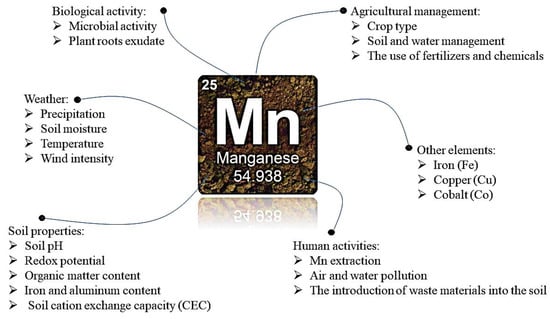 Manganese extraction as a human activity and its side effects, including air and water pollution and the entry of waste materials into the soil, could have significant effects on the mobility and state of Mn in the soil. Mn extraction activities can lead to the release of Mn in the environment and increase its concentration in the soil and the environment [23,24,25,26,27,28,29]. Some factors affecting the mobility of Mn in soil are presented in Figure 1.