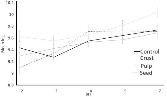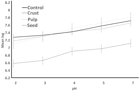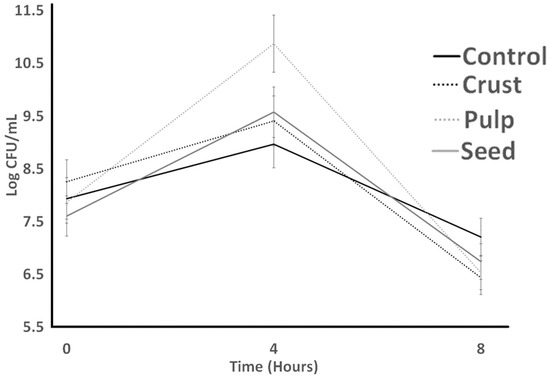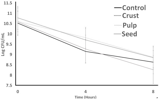 Commonly, bile salts cause a leakage of hazardous particles by emulsifying the lipid content of the cell wall [29]. Figure 1 represents ST tolerance to bile and assesses if plant resources help cultures to be maintained longer in media. Pulp caused the highest stability in ST counts, and there was no significant difference (p < 0.05) among control, seed, and pulp at the start (0 h). After 4 h, a decrease in ST counts for seed treatment could be observed compared to the control, pulp, and crust, which had no significant difference in ST counts. Seed treatment continued to decrease till 8 h, and control, pulp, and crust treatments experienced a decrease, and they had no meaningful difference from each other.