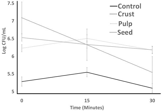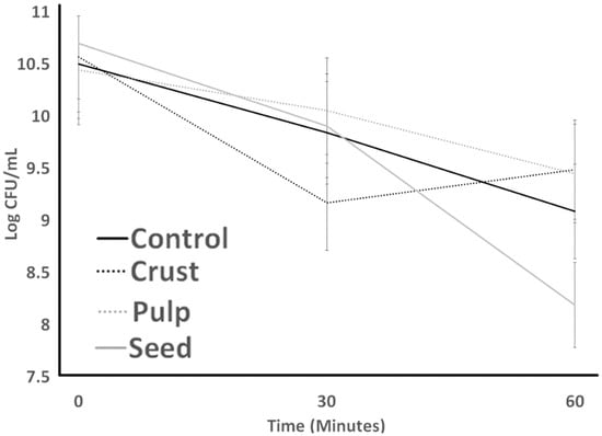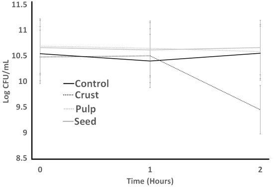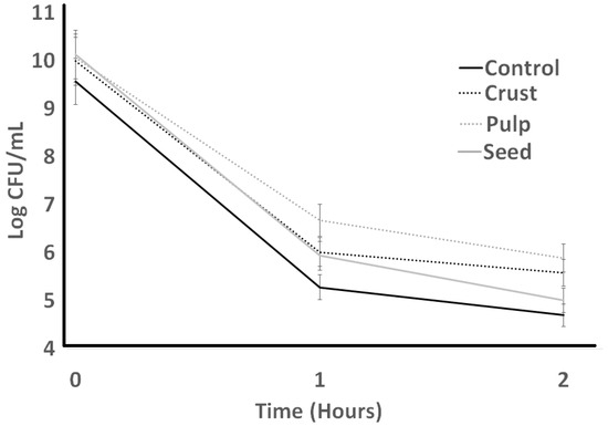 Resistance to lysozyme is indicated in Figure 7 for ST. The initial count of ST in the control had no significant difference from other treatments. The highest ST counts resulted from the seed sample, and the crust had the lowest ST counts at the end of the lysozyme resistance experiment (2 h). Seed treatments experienced an initial decrease after 1 h, and then an increase after 2 h. Crust experienced a slight increase after 1 h and then dramatically decreased after 2 h. Resistance to lysozyme is indicated in Figure 8. LB bacterial count experienced a decrease in all treatments. Treatments indicated dramatic differences at the initial count, and they decreased slightly after 1 h. The lowest LB counts resulted from the control treatment at the end, which was not significantly different (p > 0.05) from seed and crust treatments. Other treatments (pulp and crust) indicated the same LB counts at the end of the experiment.
