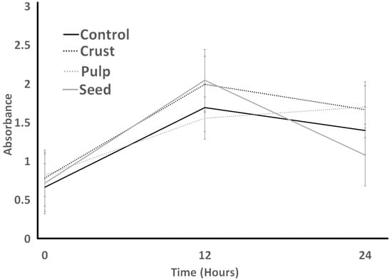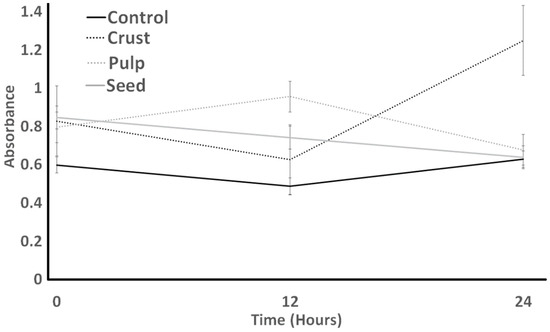 The protease activity of ST is indicated in Figure 9. The protease activity of ST showed an increase in 12 h and a slight decrease in 24 h for all treatments. The control had no significant difference (p > 0.05). Seeds had the lowest absorbance and no significant difference from crust, which had the highest absorbance at the end of the experiment. Control treatments had no significant difference from 0 to 24 h.
