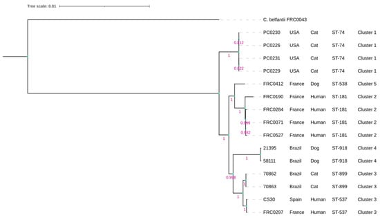 All strains were classified as C. rouxii by TYGS (Supplementary Table S1). Six different STs were identified: 74 (USA, cat), 181 (France, human), 537 (France, human; Spain, human), 538 (France, dog), 899 (Brazil, cat), and 918 (Brazil, dog) (Supplementary Table S2). The ANI values among strains ranged from 0.98 to 1.0 (Supplementary Figure S1). The strains formed five clusters. Four of them had the same host and country: Cluster 1 (USA, cat), Cluster 2 (France, human), Cluster 4 (Brazil, dog), and Cluster 5 (France, dog). Cluster 3 had isolates from cats in Brazil, humans in France, and humans in Spain (Supplementary Figure S2).