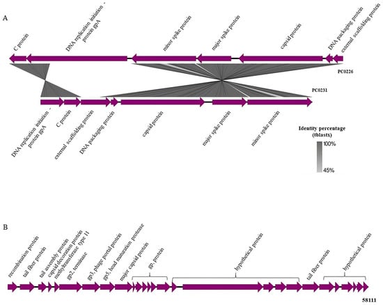 The image generated using the Easyfig application shows the identity between the intact prophages from the PC0226 and PC0231 strains and the similar products of the genes present in these regions, such as C protein, gpA protein, minor and major spike proteins, capsid, DNA packaging, and external scaffolding proteins (Figure 2A). The gpA protein of the PC0231 prophage was found to be translocated and 1179 bases were deleted when compared with the same protein in the PC0226 prophage. On the other hand, the intact prophage from the 58111 strain, more significant than the others, presented the following products in its region: recombination, tail fiber, tail assembly, capsid decoration, phage portal major proteins, besides terminals, head maturation protease, methyltransferase, and some hypothetical proteins (Figure 2B).