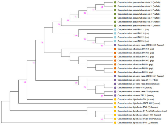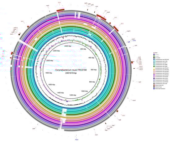 In recent years, taxonomic analysis based on the genome of C. diphtheriae strains led to the description of the novel species C. belfantii and C. rouxii [8,10]. Until now, C. rouxii has been found to cause different infections in humans, dogs, and cats [9,10,11,12,13,14]. Although the potential to infect other host species and to produce DT is a matter of concern, few studies in the literature have focused on the virulence factors, mechanisms of antimicrobial resistance, and metabolic pathways of this species. In this sense, we performed the first pangenomic analysis of this species, providing valuable insight into its pathogenicity, evolution, and diversity.