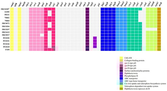 In the present study, we detected several virulence factors for which their importance has already been demonstrated in previous studies with C. diphtheriae and other species. The embC and mptC genes were identified in all genomes and are related to CdiLAM, which is responsible for forming the characteristic cell envelope in C. diphtheriae strains [73]. The gene cluster spaABC was detected in all strains, encoding the pili SpaA, which is relevant in the adherence to pharyngeal epithelial cells [74]. The surface-anchored pilus protein spaD, involved in adherence, was found in only the FRC0190T, 70862, 70863, FRC0297, and CS30 strains.