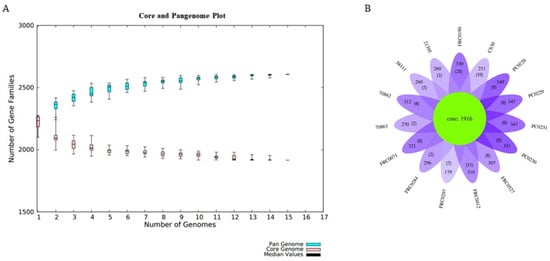 For the pangenome analysis of C. rouxii, we predicted 2606 gene families (Figure 6A), including 1916 in the core genome (73.5%), 610 related to accessory genes (23.4%), and 80 related to unique genes (3.1%). The distribution of accessory and unique genes in each strain is shown in Figure 6B. The α value was less than 1, approximately 0.95 (α = 1 − 0.05).